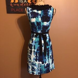 Size medium Volume One dress. Blue and black. Ruffles along neckline. Ties in the back.