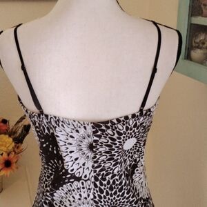 This is a pretty dress for warmer weather. Abstract, almost kaleidoscopic, floral design. Fully lined. Textured cotton. Wrap at chest, solid band under. Elastic at back top. Adjustable straps. Size M measures: 34-36 at chest, 30 under chest, 34 at hips, 36 long from shoulder to hem. Cool in every way.