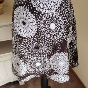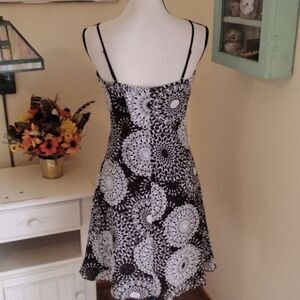 This is a pretty dress for warmer weather. Abstract, almost kaleidoscopic, floral design. Fully lined. Textured cotton. Wrap at chest, solid band under. Elastic at back top. Adjustable straps. Size M measures: 34-36 at chest, 30 under chest, 34 at hips, 36 long from shoulder to hem. Cool in every way.