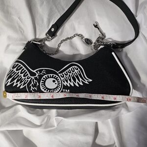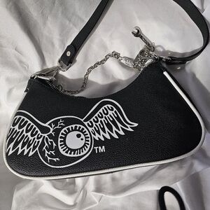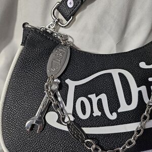 Chic Von Dutch shoulder bag with bold logo. Features chain detail and sleek design. Removable straps.