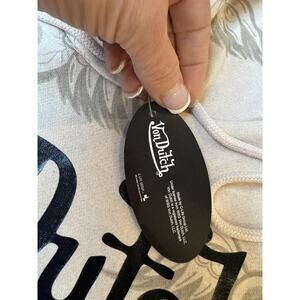 Color/Pattern: Beige/tan base with gray all-over winged eyeball print; large black Von Dutch script logo on chest