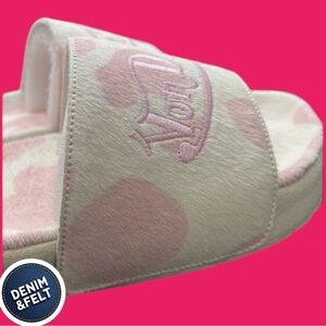 Pink and white cow print pony hair upper, Soft and comfortable footbed, Durable sole, Von Dutch logo on the strap, and Slip-on design for easy on and off.