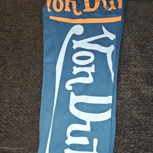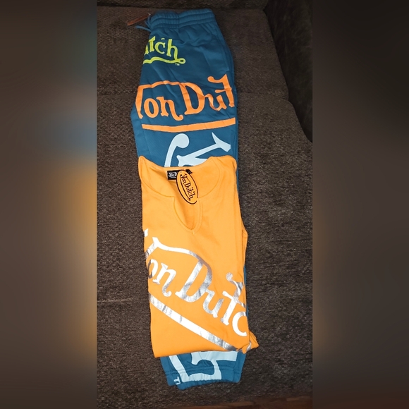 Stylish Von Dutch t-shirt in vibrant orange. Features bold logo design with Matching Joggers. Top is large and bottoms medium but run like a large