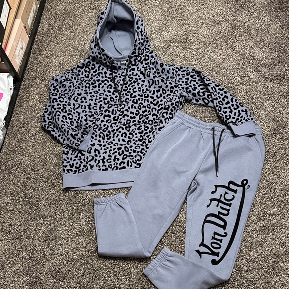 Color is “dirty blue” with black velvet leopard print and logo. Kangaroo pocket on hoodie and pockets on sides and back of sweats!
