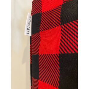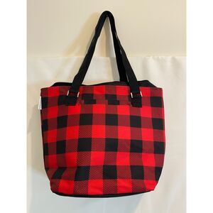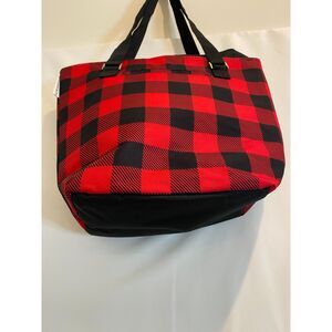 Von Maur Insulated Tote Bag Red Black Plaid Front Pocket Black Straps NEW