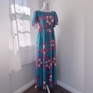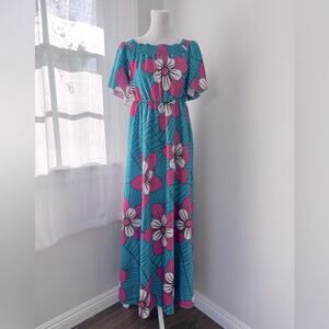 Vonda Aqua & Pink Tropical Floral Print Elastic Waist Short Sleeve Maxi Dress