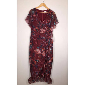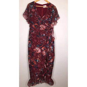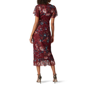 Vone Mireya Dress Red Floral Printed Lace Side Flutter Slit US 10 UK 12
