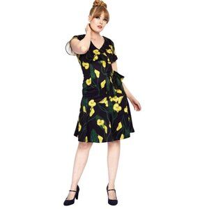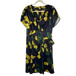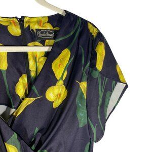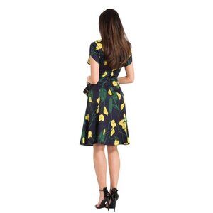 Stylish midi dress with vibrant yellow floral pattern. Features a flattering V-neck and short sleeves. Perfect for any occasion.