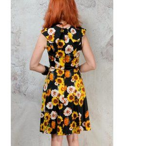Measurements are bust 34, waist 28, hips 48, shoulders 14, length 37. Light to medium weight 97% cotton 3% elastane. Fabric does have a bit of stretch!