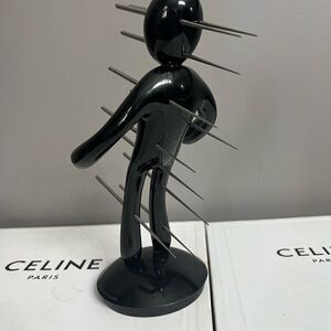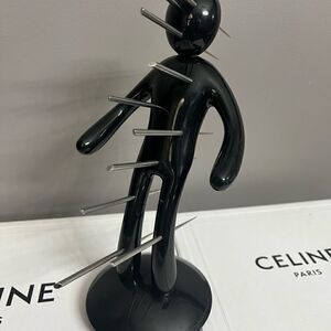 The stylized human figure in this case is pierced by 10 skewers made of stainless steel. These are used to grab the foods