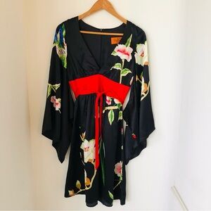 Voom by Joy Han 100% Silk Kimono Style Dress Women’s M Black Red Orchids, Parrot