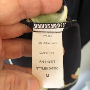 Voom by Joy Han 100% Silk Kimono Style Dress Women’s Size Medium, Featuring Black Silk with Red Attached Self Tie Waist Sash that can be tied in front or back as you prefer, Orchids & Parrots are boldly displayed in the design, Gorgeous Kimono Style Sleeves, V Neckline, Zip Up in the Back, Mini Length, Made in USA, Dry Clean Only. This is a stunner… in great used condition.