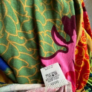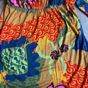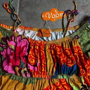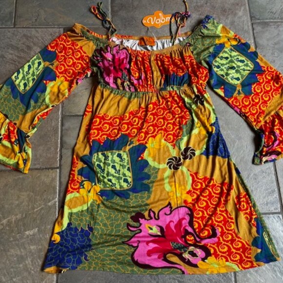 This dress embodies a free-spirited, boho-chic aesthetic, ideal for casual outings, music festivals, or as a statement piece in a summer wardrobe. It pairs well with ankle boots or sandals. Featuring an off-the-shoulder neckline with thin adjustable straps for support. It has long bell sleeves, which add dramatic flair and a vintage-inspired touch. The dress features an empire waist with elastic gathering under the bust for a flattering, relaxed fit. The soft, lightweight fabric has stretch and drapes well, too. It falls to a mini-length, making it great for warm weather or festival wear. The brand, Voom by Joy Han, is known for its designer creations, and this one is no exception. The patchwork-style floral and abstract motifs add a psychedelic, artistic vibe, making this dress ideal for a summer day or a retro-themed outing; a must-have addition to any fashion-forward woman's closet.