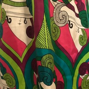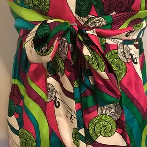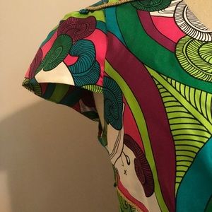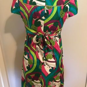 Multicolored dress with gold piping - only worn once! Has little cap sleeves and a bow that ties in the back.