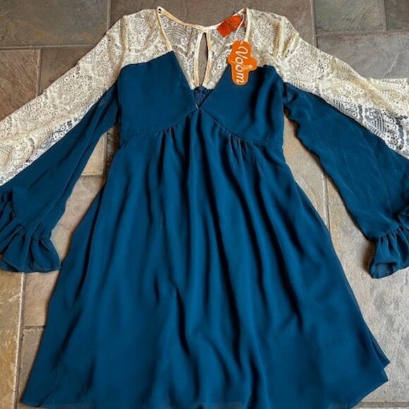 The main fabric is rich teal blue, lightweight chiffon, with a smooth and flowing drape. The bodice is fully lined for comfort and modesty. This stunning dress features a deep V-neckline and an empire waist cut, which flatters the bust and elongates the silhouette. Fit may be adjusted with straps in the back. One of the most striking features of this dress is the long illusion laced bell sleeves. The top of the sleeves and shoulder area are made from delicate ivory lace, adding a romantic contrast to the teal fabric. The lace is detailed and sheer, while the lower sleeve transitions back to the teal fabric and ends in dramatic, layered ruffles. The dress has a keyhole opening at the back neckline, fastened with a button for added detail and ease of wear. The brand, Voom by Joy Han, is known for its designer creations, and this one is no exception. The dress falls above the knee, making it suitable for daytime wear, date nights, or semi-formal occasions, a must-have addition to any fashion-forward woman's closet.