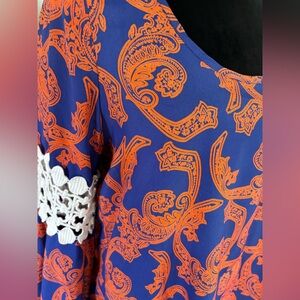 This is a Voom by Joy Han royal blue and orange paisley shift dress with white lace bell sleeves.