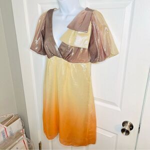 Voom by Joy Han Brown Orange Bow Shimmery Metallic Silk Cocktail Dress Size Small. Balloon sleeves. Short sleeves. Faux wrap neckline. Fitted empire waist. Iridescent Metallic Ombre silk fabric. Bow shoulder. Truly unique statement piece. Rare find! Gently used Good Preowned Condition. Few slight pulls see photo. Not noticeable. Otherwise is very good condition.