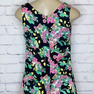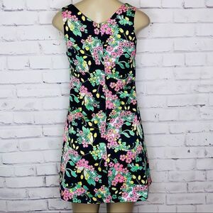 This dress is tailored like a 60s classic gogo dress with a high neckline and hemline. The groovy floral pattern is beautiful with a little bit of ribbed texture. Lined with a zip up back . Smoke free home