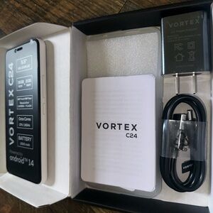 Vortex C24 smartphone with 5.5" IPS display. Black finish. 16GB ROM and 2GB RAM. Powered by Android 14. Compact, sleek design. Brand new, unlocked. Only opened to for photos to sell.