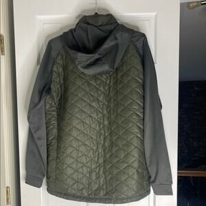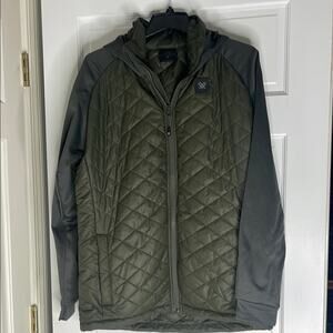 This olive green puffer jacket boasts a stylish diamond quilting pattern that enhances both warmth and texture. The stand-up collar and attached hood offer additional protection against the cold, ensuring comfort and style in chilly weather.