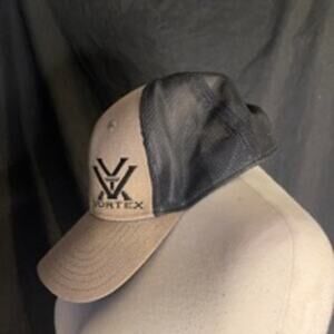 Show your outdoor spirit with this Vortex Optics logo trucker hat. Featuring a tan structured front panel with bold black Vortex logo and a breathable black mesh back, this cap offers both style and function. Adjustable snapback closure ensures a comfortable fit. Perfect for casual wear, hunting trips, outdoor adventures, or as part of your everyday streetwear.