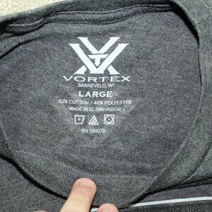 Crafted for the outdoor enthusiast, the Vortex Optics Shield Men's T-Shirt blends style with comfort. Available in a versatile heather charcoal gray, this size medium top features a classic crew neckline and short sleeves suitable for any season. The shirt is made from a durable fabric blend of 52% cotton and 48% polyester, ensuring both softness and strength. With its eye-catching graphic print and subtle logo accent, this T-shirt makes a statement while remaining tasteful. The regular fit design offers ample movement and a relaxed feel, perfect for both active days in the field and casual outings. Machine washable for easy care, this Vortex-branded tee is a staple piece for any wardrobe that values quality and a touch of adventure.