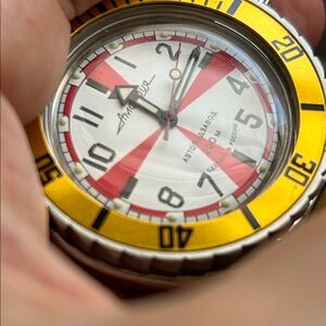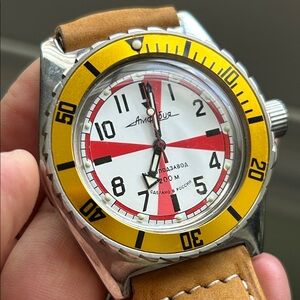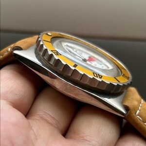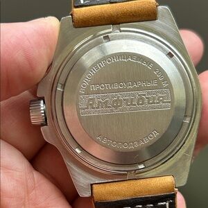 ▪️Tan leather straps/ Shock-resistant 👍🏻/ Water resistance 200m/ Functions: Sensitive watch with a central second hand/ Acrylic top/ The watch's power reserve lasts for 31 hours after a full winding/ Rotating Bezel