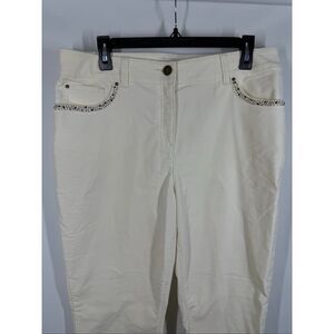 Beautiful thin material (great for spring/summer). 100% Polyester, side zip entry, straight leg-classic fit. Great dress pants for work or an event with a nice blouse & some heels. Dry clean only. Still has tag. More of a taupe color. Tag says "Bisque" as their description of color. 11.5 inches from waist to front crotch seam. Inseam about 30”. Waist 13.5”.