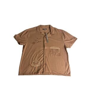 Elevate your wardrobe with this stylish and versatile button-up shirt from Vox Populi. Crafted with precision and attention to detail, this brown embroidered coffee theme shirt is the perfect addition to any fashion-forward individual's collection. With its high-quality materials and expert craftsmanship, it offers both comfort and durability, making it a must-have for any occasion. Brand new with the tag.