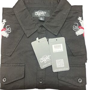 Stylish embroidered cream button-up shirt. Features a embroidered cityscape design. Perfect for casual outings.