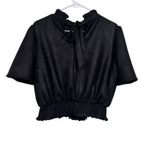 Gently worn women's size large VOY faux suede ruffle short sleeve tie back shimmer. Stretchy smocked bottom, peasant neckline and sleeve. Please review all photos for any signs of wear-pictured as is. Disclaimer: Any items with any wear/staining has not been treated, and unsure of ability to remove/treat condition. Comes from a smoke free home, bundle with other items to save & minimize shipping cost.
