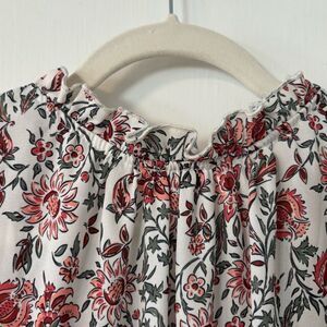 Voy 1X floral print peplum pleated cap sleeve ruffle neck blouse