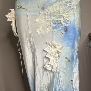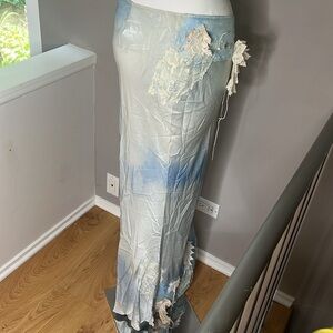 This is a gorgeous Voyage 1990’s Size 12 Long 100% Silk Mesh Chantilly Lace low waist Skirt. Shows minor scuffs and minor wear. Full length 43”