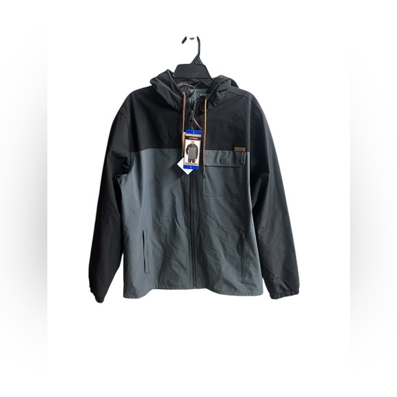 New with tags Voyager men’s windbreaker. Black and grey colorblock. Side slit pockets. Hood. Full zip front. Chest pocket.