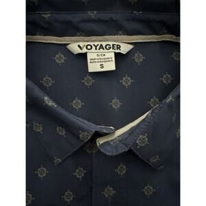 The Voyager Men's Blue Short Sleeve Button-Up Shirt is a stylish and casual option for men during the summer and spring seasons. Made from a woven fabric with a nautical pattern, this collared shirt features a regular fit and a button-up closure. The shirt is machine washable and comes in a size small, perfect for a comfortable and relaxed look. The accent of buttons adds a touch of detail to this classic and versatile piece from the Voyager brand.