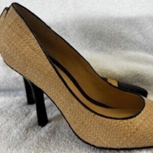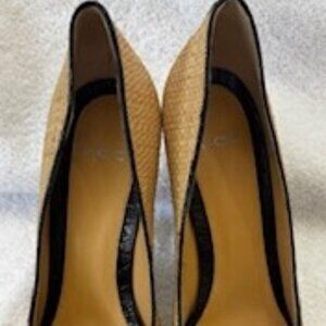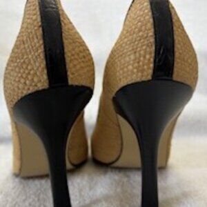 Vintage Voz brand basket woven raffia heeled pumps with croc embossed cap toe and croc embossed accented strip at the heel. Heel measures appx 4" and these are in very very good shape. Every high end shoe maker put out a similar style (Chanel, Dolce & Gabbana, etc.) which I couldn't afford but these were just as lovely and affordable. I only wore them once. No box.