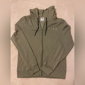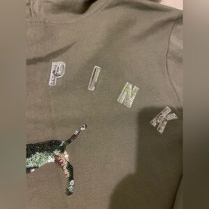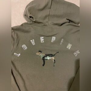 NWOT and no defects at all. 1st picture is a shadow not a stain. Size medium Vs. pink bling army green full zip hoodie with metallic silver Writeout on front and the back has silver bling writeout and a camo bling dog. Armpit to armpit 21” and centerback length is 24”. Retail $79.95. Price firm. Tote 12.