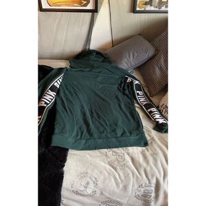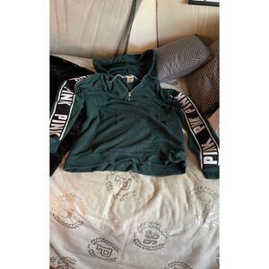 Size small Victoria’s Secret pink hunter green slouchy quarter zip hooded sweatshirt this features the quarter zip with a large circle zipper pole and has and elasticized straight featuring the logo three times going down each arm very good addition no rips stains etc. again this is considered slouchy style so it is going to be oversized the small could easily set up to a size large be sure to check out my page I have several different sizes and styles available I specialize in Victoria’s Secret pink vintage and hard to find styles I also specialize in Michael Kors coach Steve Madden Kenneth Cole BCBG Bebe Betsey Johnson juicy couture Nike Reebok gym shark Lula Roe I have a swimwear sweatshirt sweatpants or leggings shorts sleepwear north face pretty much if you want it I have it LOL