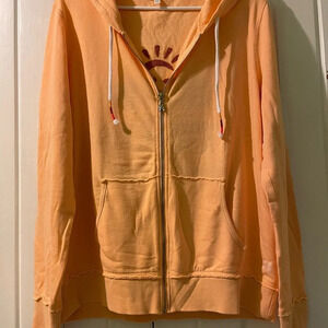 Euc with no defects. Gently worn from 2015. Size large Victoria’s Secret hoodie. Sort of a peachy orange color with cute saying on back in a really cute texture. Armpit to armpit is 23” and centerback length is 24 1/2”. Super cute!