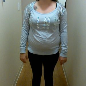 Its a M but fits bigger its been worn more than a couple times has a couple stains on belly and one on sleeve and it has little fuzz balls on it its a really light light purple color