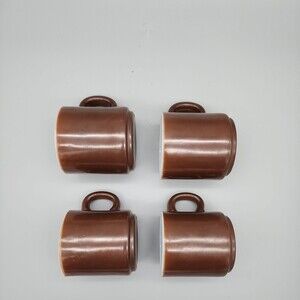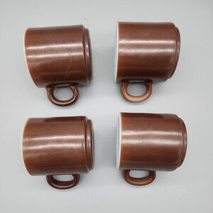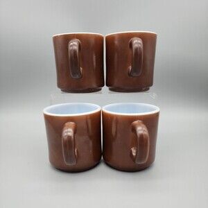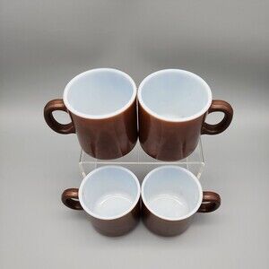Vintage lot of four Hazel Atlas Glass Two-Toned Stackable Coffee Mugs Coffee Cups - Brown & White with D Handles. These are in exceptional condition. No chips, cracks, or repairs. There are only a few places where the brown has worn off. See photos. Inside each mug there is a brown mark. Looks like it happened during the manufacturing process. See photos. Measurements are inside photos. Item is sold as is.