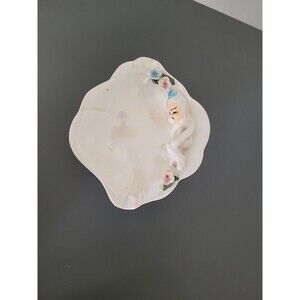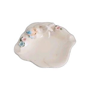 The VTG LEFTON Elf Pixie lusterware iridescent Ashtray/trinket dish # 786 is a small, ceramic white dish with a pixie lying on the edge. This original 1950s piece is decorated in a glossy finish, featuring a fantasy theme perfect for collectors of decorative sculptures and figurines.