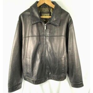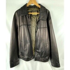 Vintage Rainforest Jacket in Men's size XL, please see measurements below. In color black with olive green quilted lining. 100% Genuine Pebbled Leather. Heavyweight jacket, soft leather. Exterior side pockets, two interior pockets. In very excellent preowned condition!