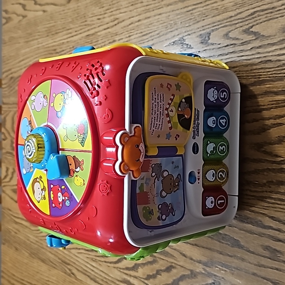Vtech Sort & Discover Activity Cube, wonderful developmental toy. Seven fun activities and two electronic panels that introduce colors, numbers, animals and more. Great for developing fine motor skills, also develops hand-eye coordination with the shape sorter. Missing shape sorters. Ages 9 -36 mos. EUC!