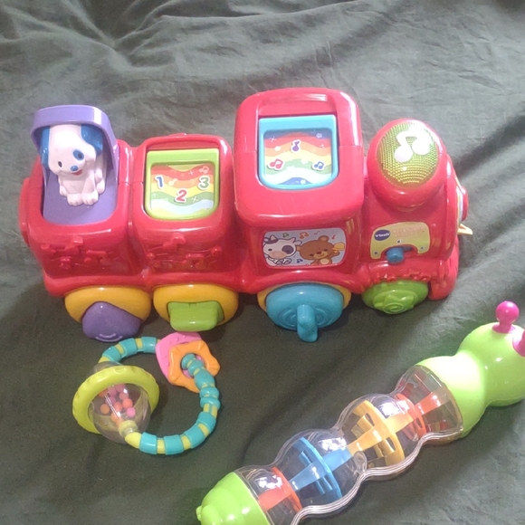 Bright and engaging battery operated train toy featuring vibrant colors (for older babies or young toddlers). Pull string. Batteries included and it works ! Very satisfying sounding rain stick style caterpillar rattle with colorful beads that slowly trickle down, and a handheld rattle. Good used condition with minimal wear. Train is VTech. Unsure on a brand for the rattles.
