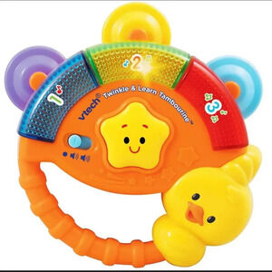 Tap the star button to learn numbers and hear playful phases and fun sounds. Shake it and hear real tambourine sounds when the electronics are off and hear playful phrases and sounds when they are on. The bird button also plays a variety of melodies. Plays 25+ sing-along songs, melodies, sound effects and fun phrases. Three flashing lights attract attention and the motion sensor encourages motor skill development. Plus, the Twinkle & Learn Tambourine’s small size makes it ideal for take-along play.