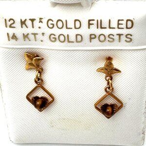 Elegant vintage earrings feature 12K gold-filled design with 14K gold posts. The tiger's eye stone adds a sophisticated touch, perfect for timeless style.