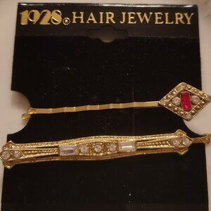 Vtg 1928 Hair Jewelry Gold Tone Red and Clear Rhinestone Hairpin Set