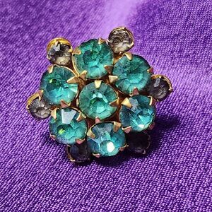Likely dating to the late 1930s1940s, this classic floral/starburst design reflects early mid-century costume jewelry craftsmanship. Stones are prong-set and sparkle beautifully in natural light.