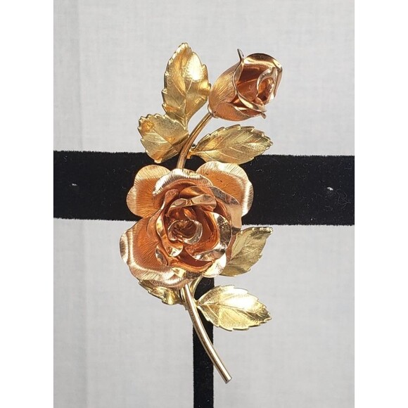 Vintage 1950's Krementz Signed Two Tone Gold Filled Vermeil Rose Roses Brooch Pin 2.25" long Stamped Sterling Silver 925 1/20 12k GF Vermeil